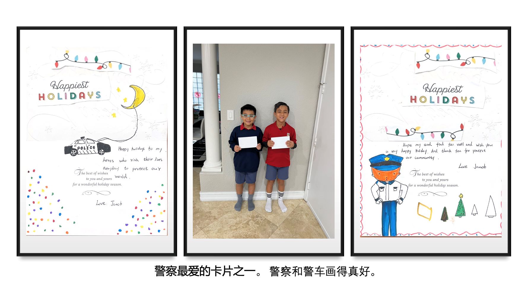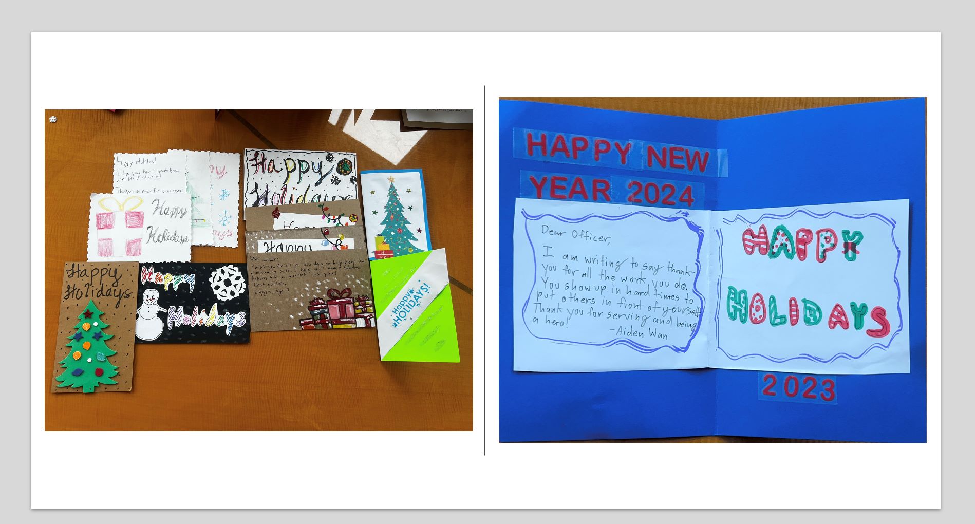 2023年12月,佛州华人华侨联合会学生读书会为棕榈滩县警察办公室的警察和工作人员制作了节日贺卡。有 17 名学生会成员参与了此次活动,以表达我们对警长办公室为社区所做的辛勤工作的感谢。随附学生读书会组织人索菲亚·奥尔森 (Sofia Olson) 将卡片交给第四区治安官办公室的 J. Wink 中尉的照片。