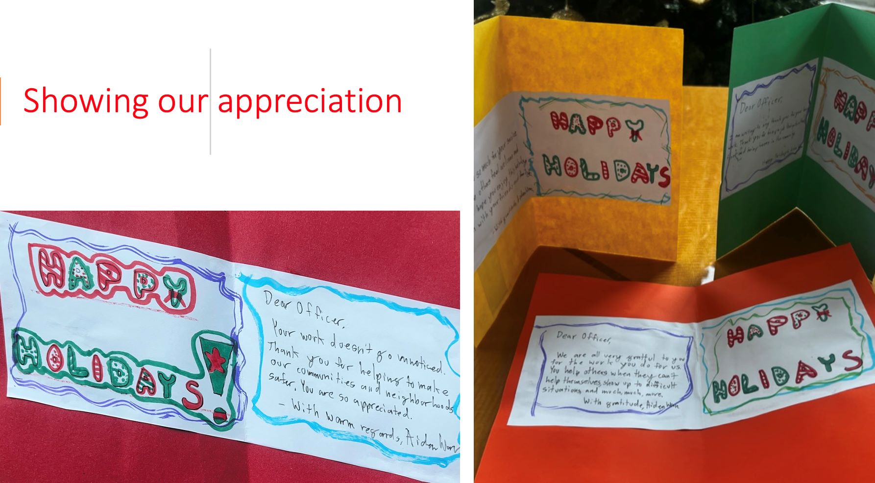 In December of 2023, CASEC Student Academic Club made holiday cards for the deputies and staff in Palm Beach County Sheriff’s Office. There were 17 students who participated in making these cards to show our appreciation for the hard work that the Sheriff’s Office provides to our community throughout the year. Attached are the pictures that Student Academic Club organizer Sofia Olson deliveried the cards to Lt. J. Wink of the District 4 Sheriff’s Office.