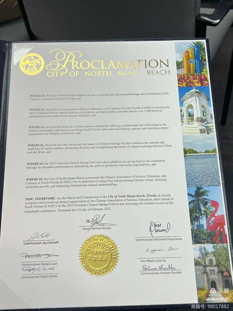 北迈阿密海滩市政府颁发给华联的褒奖令